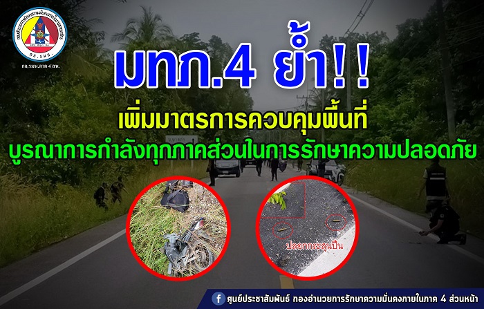 ทั้งนี้ กองอำนวยการรักษาความมั่นคงภายในภาค 4 ส่วนหน้า ต้องขอความร่วมมือมายังพี่น้องประชาชนในพื้นที่ หากพบเห็นสิ่งผิดปกติ หรือบุคคลต้องสงสัยเข้ามาเคลื่อนไหวในพื้นที่ สามารถแจ้งได้ที่เบอร์สายตรงแม่ทัพภาคที่ 4 โทร 061 – 173 – 2999 และเบอร์สายด่วน 1341 หรือหน่วยเฉพาะกิจในพื้นที่ได้ตลอด 24 ชั่วโมง