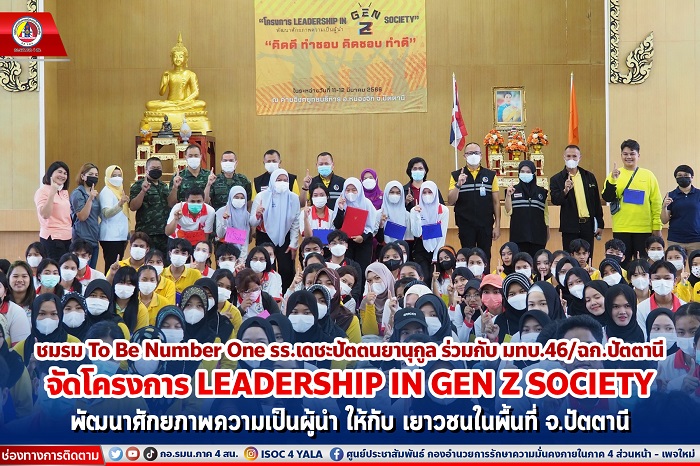 เมื่อวันที่ 11 มีนาคม 2566 ที่ อาคารศาสนสถาน ค่ายอิงคยุทธบริหาร ตำบลบ่อทอง อำเภอหนองจิก จังหวัดปัตตานี พันเอก กฤศณัฏฐ์ จันทร รองผู้บังคับหน่วยเฉพาะกิจปัตตานี พร้อมด้วย คุณนุชนาถ สือรี รองผู้อำนวยการโรงเรียนเดชะปัตตนยานุกูล และ คุณเปรมจิตร หงส์อำไพ รองนายแพทย์สาธารณสุขจังหวัดปัตตานี ร่วมเปิดโครงการ “LEADERSHIP IN GEN Z SOCIETY พัฒนาศักยภาพความเป็นผู้นำ” ซึ่งเป็นการดำเนินกิจกรรมของชมรม To Be Number One โรงเรียนเดชะปัตตนยานุกูล ร่วมกับ มณฑลทหารบกที่ 46/หน่วยเฉพาะกิจปัตตานี ที่จัดขึ้นระหว่างวันที่ 11 – 12 มีนาคม 2566 ที่ผ่านมา โดยมียอดเยาวชนเข้าร่วมกิจกรรมจำนวน 220 คน