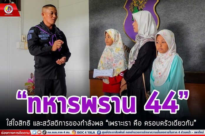เมื่อวันที่ 14 มีนาคม 2566 เวลา 09.00 น. ที่ กองบังคับการ หน่วยเฉพาะกิจกรมทหารพรานที่ 44 ตำบลปะเสยะวอ อำเภอสายบุรี จังหวัดปัตตานี พันเอก ภาคภูมิ จันทรักษ์ ผู้บังคับหน่วยเฉพาะกิจกรมทหารพรานที่ 44 เป็นผู้แทนผู้บังคับกองกำลังทหารพรานจังหวัดชายแดนใต้ ในการมอบเงินสินไหมทดแทน จำนวน 2 รายการ ประกอบด้วย เงินช่วยเหลือจากหน่วยทหารพรานในพื้นที่จังหวัดชายแดนภาคใต้ 12 หน่วย จำนวน 180,000 บาท และเงินช่วยเหลือจาก หน่วยเฉพาะกิจกรมทหารพรานที่ 44 จำนวน 139,000 บาท ให้กับทายาทของ อาสาสมัครทหารพราน อิลฟัน ยูโซะ ซึ่งเป็นกำลังพลของหน่วย และเสียชีวิตจากเหตุถูกลอบทำร้าย (ถูกยิง) เมื่อวันที่ 29 มกราคม 2566 ที่ผ่านมา โดยทางหน่วยเฉพาะกิจกรมทหารพรานที่ 44 ได้มอบเงินช่วยเหลือดังกล่าว ให้กับทายาทของกำลังพลที่เสียชีวิต (ตามเอกสารที่กำลังพลผู้เสียชีวิตได้ระบุชื่อผู้รับสินไหมทดแทน)