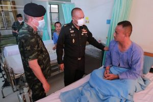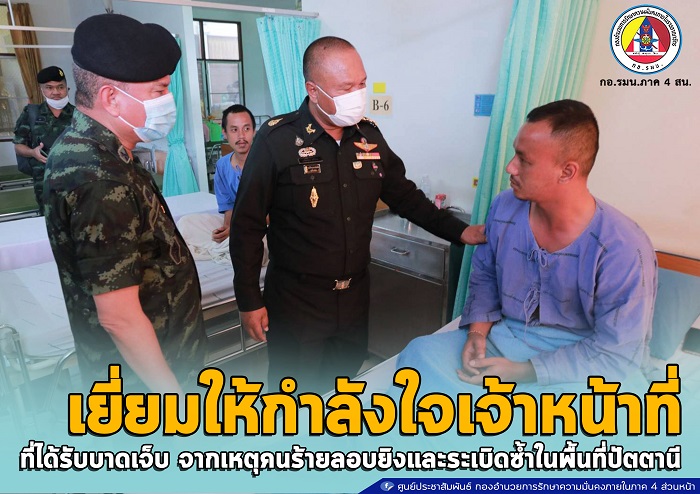โดยผู้ได้รับบาดเจ็บทั้ง 4 นาย ได้เข้ารับการรักษาตัวยังโรงพยาบาลปัตตานี อ.เมือง จ.ปัตตานี และ โรงพยาบาลค่ายอิงคยุทธบริหารจังหวัดปัตตานี อ.หนองจิก จ.ปัตตานี ประกอบด้วย อส. สุทธิชัย ยะวา,ร.ท. ต่อตระกูล ปั้นสำรอง ,อส.ทพ.ชยพร บุษบง และ อส.ทพ.อิสรพงษ์ แก้วรักษ์ ทั้งนี้ แม่ทัพภาคที่ 4 ได้นำความห่วงใยจาก พลเอก ณรงค์พันธ์ จิตต์แก้วแท้ ผู้บัญชาการทหารบก ที่ฝากถึงเจ้าหน้าที่ผู้ได้รับบาดเจ็บ พร้อมมอบกระเช้าเยี่ยมป่วยและเงินช่วยเหลือเบื้องต้น เพื่อเป็นขวัญและกำลังใจ พร้อมทั้งกล่าวขอบคุณเจ้าหน้าที่ที่ได้ปฏิบัติหน้าที่อย่างเต็มความสามารถ ขณะนี้ ผู้ได้รับบาดเจ็บทั้ง 4 นาย อยู่ในความดูแลของแพทย์ อาการปลอดภัยมีขวัญและกำลังใจที่ดี และพร้อมที่จะกลับไปปฏิบัติหน้าที่เพื่อประเทศชาติต่อไป