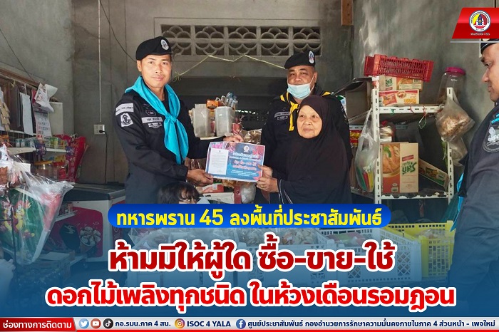 เมื่อวันที่ 19 มีนาคม 2566 ที่ อำเภอระแงะ จังหวัดนราธิวาส ชุดปฏิบัติการกิจการพลเรือนของกองร้อยหน่วยขึ้นตรง หน่วยเฉพาะกิจกรมทหารพรานที่ 45 ลงพื้นที่ ประชาสัมพันธ์ห้ามมิให้ผู้ใด ซื้อ-ขาย-ใช้ ดอกไม้เพลิงทุกชนิด ในห้วงเดือนรอมฎอน เพื่อให้การปฏิบัติศาสนกิจ ตามประเพณีและวัฒนธรรมอันเต็มเปี่ยมด้วยความเคารพ ศรัทธา เชื่อมั่น ต่อองค์ศาสดา เป็นไปด้วยความสงบเรียบร้อย ปราศจากการแทรกแซง และเหตุการณ์รบกวนที่อาจส่งผลกระทบต่อความมั่นคงในจังหวัดชายแดนภาคใต้ในห้วงเวลาดังกล่าว