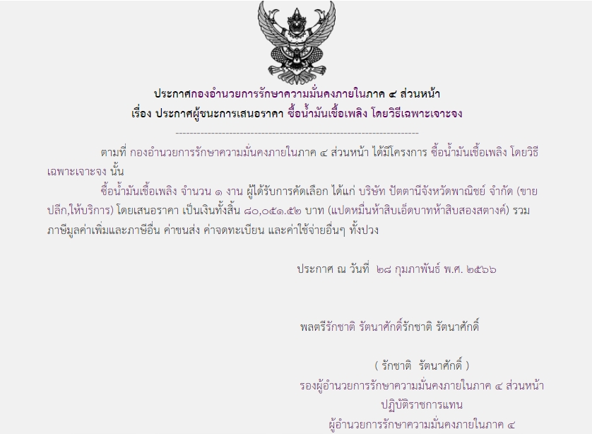 ประกาศผู้ชนะการเสนอราคา ซื้อน้ำมันเชื้อเพลิง โดยวิธีเฉพาะเจาะจง