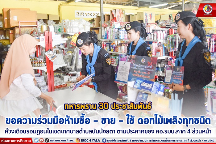 ที่ เทศบาลตำบลบันนังสตา อำเภอบันนังสตา จังหวัดยะลา หน่วยเฉพาะกิจกรมทหารพรานที่ 30 จัดกำลังพลชุดปฏิบัติการกิจการพลเรือน หมวดทหารพรานหญิง 30 เข้าพบปะพูดคุยกับประชาชน เจ้าของร้านค้าในเขตเทศบาลตำบลบันนังสตา เพื่อประชาสัมพันธ์เกี่ยวกับการห้าม ซื้อ ขาย ดอกไม้เพลิง พลุ ประทัด และวัตถุอื่นใดอันมีสภาพคล้ายคลึงกันที่ทำให้เกิดเสียงดัง ในช่วงเดือนรอมฎอน ตั้งแต่วันที่ 20 มีนาคม 2566 ถึง วันที่ 30 เมษายน 2566 ตามประกาศของกองอำนวยการรักษาความมั่นคงภายในภาค 4 ส่วนหน้า