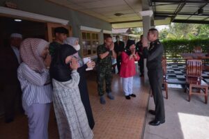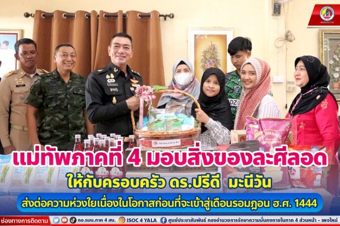วันนี้ 21 มีนาคม 2566 เวลา 10.00 น. ณ บ้านเลขที่ 160 หมู่ที่ 5 ตำบลยะรัง อำเภอยะรัง จังหวัดปัตตานี พลโท ศานติ ศกุนตนาค แม่ทัพภาคที่ 4 / ผู้อำนวยการรักษาความมั่นคงภายในภาค 4 และคณะ เดินทางพบปะเยี่ยมให้กำลังใจ กับครอบครัว ดร.ปรีดี มะนีวัน ที่ปรึกษาสมาคมเพื่อสันติภาพชายแดนใต้ (POSBO)/นักวิชาการวัฒนธรรมชำนาญการ สำนักงานวัฒนธรรมจังหวัดปัตตานี พร้อมมอบอินทผาลัม เครื่องอุปโภค บริโภค ที่ใช้สำหรับการละศีลอด โอกาสนี้แม่ทัพภาค ที่ 4 ได้พูดคุยให้กำลังใจกับครอบครัว โดยระบุว่า การเดินทางมาเยี่ยมเยียนครั้งนี้ ก็มาให้กำลังใจ อวยพร เนื่องในโอกาสที่จะเข้าสู่เดือนรอมฎอนที่จะมาถึง ซึ่งตลอดระยะเวลา 1 เดือน ก็จะต้องถือศีลอดและปฏิบัติศาสนกิจต่างๆ ขอให้ครอบครัวประสบแต่ความสุข ให้เดือนรอมฎอนเป็นเดือนแห่งการเปลี่ยนแปลงและเป็นที่รักของทุกคน