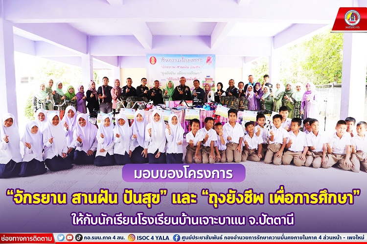 เมื่อวันที่ 21 มีนาคม 2566 เวลา 14.30 น. เจ้าหน้าที่โรงพยาบาลค่ายอิงคยุทธบริหาร ลงพื้นที่ไปยังโรงเรียนบ้านเจาะบาแน ตำบลลุโบะยิไร อำเภอมายอ จังหวัดปัตตานี เพื่อนำรถจักรยาน จำนวน 1 คัน พร้อมถุงยังชีพ และ หนังสือที่ได้รับการบริจาค มามอบให้กับน้องๆ นักเรียนโรงเรียนบ้านเจาะบาแน ตามโครงการ “จักรยาน สานฝัน ปันสุข” และ “ถุงยังชีพ เพื่อการศึกษา” ซึ่งเป็นโรงเรียนในพระราชูปถัมภ์ของสมเด็จพระกนิษฐาธิราชเจ้า กรมสมเด็จพระเทพรัตนราชสุดาฯ สยามบรมราชกุมารี เพื่อที่จะได้สร้างโอกาสให้น้องๆ ได้รับประโยชน์สูงสุดจากทั้ง 2 โครงการ ดังกล่าว