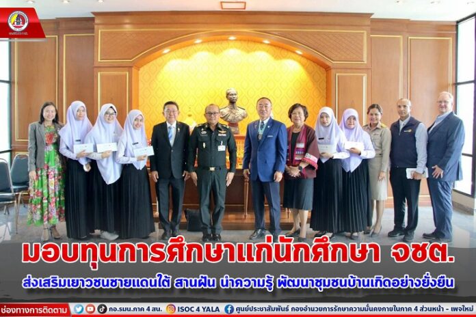 เมื่อวันที่ 22 มีนาคม 2566 เวลา 11.00 น. สำนักมวลชนและกิจการพิเศษ กองอำนวยการรักษาความมั่นคงภายในภาค 4 ส่วนหน้า (สมศ.กอ.รมน.ภาค 4 สน.) นำนักศึกษาหลักสูตรพยาบาลศาสตร์จาก มหาวิทยาลัยรังสิต และ มหาวิทยาลัยกรุงเทพธนบุรี ที่มีภูมิลำเนาในพื้นที่ จังหวัดยะลา, ปัตตานี และ นราธิวาส จำนวน 5 คน เข้าร่วมพิธีมอบทุนการศึกษา ประจำปี 2566 โดยมูลนิธิโรตารี ภาค 3350 ร่วมกับ มูลนิธิเพื่อการศึกษาบริเวณชายแดน ได้มอบหมายให้ กองอำนวยการรักษาความมั่นคงภายในภาค 4 ส่วนหน้า คัดเลือกนักศึกษาพยาบาลที่มีคุณสมบัติครบถ้วน เข้ารับทุนต่อเนื่อง เป็นปีที่ 2 ณ ห้องเจ้าพระยาไชยานุภาพ กรมกิจการชายแดนทหาร กรุงเทพมหานคร โดยมี พลตรี บรรลุ เอี่ยมศรี ผู้อำนวยการสำนักปฏิบัติการเพื่อความมั่นคง, คุณนครินทร์ รัตนกิจสุนทร, คุณมิตสึทากะ อิตะ, Rtn.Martin Ellag จากสโมสรโรตารี เป็นประธานฯ