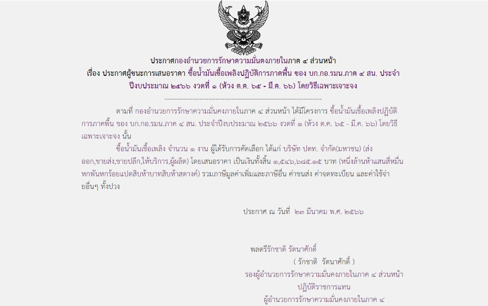 จัดซื้อ จัดจ้างประกาศผู้ชนะการเสนอราคา ประกาศผู้ชนะการเสนอราคา ซื้อน้ำมันเชื้อเพลิงปฏิบัติการภาคพื้น ของ บก.กอ.รมน.ภาค ๔ สน. ประจำปีงบประมาณ ๒๕๖๖ งวดที่ ๑ (ห้วง ต.ค. ๖๕ – มี.ค. ๖๖) โดยวิธีเฉพาะเจาะจง March 23, 2023 328 Share Facebook Twitter Google+ Telegram LINE