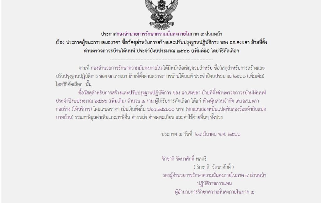 จัดซื้อ จัดจ้างประกาศผู้ชนะการเสนอราคา ประกาศผู้ชนะการเสนอราคา ซื้อวัสดุสำหรับการสร้างและปรับปรุงฐานปฏิบัติการ ของ ฉก.สงขลา ย้ายที่ตั้ง ด่านตรวจถาวรบ้านโต้นนท์ ประจำปีงบประมาณ ๒๕๖๖ (เพิ่มเติม) โดยวิธีคัดเลือก March 25, 2023 493 Share Facebook Twitter Google+ Telegram LINE