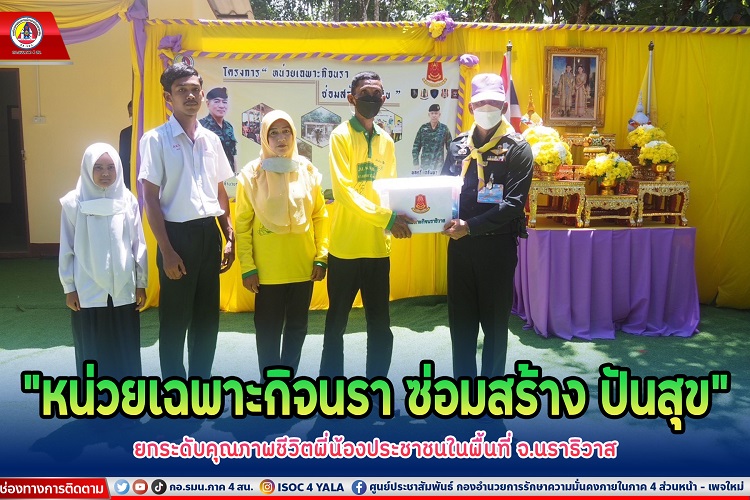 เมื่อวันที่ 26 มีนาคม 2566 เวลา 10.30 น. ที่ บ้านเลขที่ 82 หมู่ที่ 2 ตำบลผดุงมาตร อำเภอจะแนะ จังหวัดนราธิวาส พลตรี เฉลิมพร ขำเขียว ผู้บัญชาการกองพลทหารราบที่ 15 / ผู้บังคับหน่วยเฉพาะกิจนราธิวาส ส่งมอบบ้าน ตามโครงการ “หน่วยเฉพาะกิจนรา ซ่อมสร้าง ปันสุข” ให้กับ นายอาลีย๊ะ ดือเร๊ะ ซึ่งเป็นประชาชนที่มีฐานะยากจน และให้ความร่วมมือกับส่วราชการ และหน่วยของรัฐเป็นอย่างดีมาโดยตลอด เพื่อเป็นการพัฒนาคุณภาพชีวิตสร้างขวัญและกำลังใจ เพิ่มพูนความสุข ให้กับพี่น้องประชาชนในพื้นที่จังหวัดนราธิวาส โดยมี พันเอก ภาณุวัฒน์ สุคชเดช ผู้บังคับหน่วยเฉพาะกิจกรมทหารพรานที่ 49, นายกองค์การบริหารส่วนตำบลผดุงมาตร, ผู้แทนส่วนราชการ, กำนัน, ผู้ใหญ่บ้าน, อิหม่ามประจำตำบล และประชาชน เข้าร่วมในพิธี