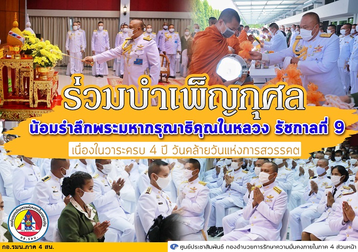 วันนี้ ( 12 ต.ค.63,0630 ) พลโท เกรียงไกร ศรีรักษ์ แม่ทัพภาคที่ 4 เป็นประธานในพิธีทำบุญตักบาตรข้าวสาร อาหารแห้งแก่พระภิกษุสงฆ์ เพื่อถวายเป็นพระราชกุศล ครบรอบ 4 ปี วันสวรรคต พระบาทสมเด็จพระบรมชนกาธิเบศร มหาภูมิพลอดุลยเดชมหาราช บรมนาถบพิตร 13 ตุลาคม 2563 ก่อนเป็นประธานในพิธีสวดพระพุทธมนต์ถวายเป็นพระราชกุศลตามลำดับ โดยมีข้าราชการ หน่วยงานภายในค่ายวชิราวุธ กำลังพลหน่วยขึ้นตรงกองทัพภาคที่ 4 สมาคมแม่บ้านทหารบกสาขากองทัพภาคที่ 4 เข้าร่วมพิธีอย่างพร้อมเพรียง ต่างรำลึกในพระมหากรุณาธิคุณอันล้นพ้นหาที่สุดมิได้ ของพระบาทสมเด็จพระบรมชนกาธิเบศร มหาภูมิพลอดุลยเดชมหาราช บรมนาถบพิตร ที่ได้ทรงบำเพ็ญพระราชกรณียกิจเพื่อบำบัดทุกข์บำรุงสุขแก่ปวงชนชาวไทยนานับประการตราบจนกระทั่งเสด็จสวรรคต ณ สโมสรรื่นฤดี ค่ายวชิราวุธ อ.เมือง จ.นครศรีธรรมราช