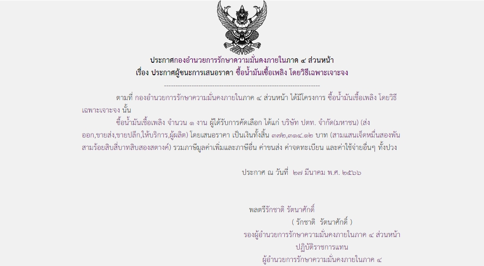 จัดซื้อ จัดจ้างประกาศผู้ชนะการเสนอราคา ประกาศผู้ชนะการเสนอราคา ซื้อน้ำมันเชื้อเพลิง โดยวิธีเฉพาะเจาะจง March 28, 2023 479 Share Facebook Twitter Google+ Telegram LINE