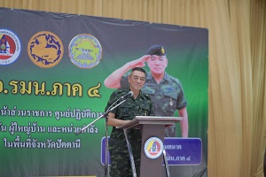 พลโท ศานติ ศกุนตนาค แม่ทัพภาคที่ 4 / ผู้อำนวยการรักษาความมั่นคงภายในภาค 4 กล่าวว่า กำนัน ผู้ใหญ่บ้าน เป็นกำลังหลักในการขับเคลื่อนสร้างการรับรู้สร้างความเข้าใจแก่พี่น้องประชาชนมากที่สุด เพราะอยู่ใกล้ชิดลูกบ้านของตนเอง โดยเฉพาะในพื้นที่ที่ตนรับผิดชอบ ดูแลปกป้องประชาชน ให้มีความปลอดภัยในชีวิตและทรัพย์สิน ภายใต้นโยบายสำคัญเร่งด่วน คือการแก้ไขปัญหายาเสพติด ตัดวงจรผู้เสพ ผู้ค้ายาเสพติดทุกพื้นที่ภาคใต้ โดยเฉพาะผู้เสพฯ ที่มีความก้าวร้าว ด้วยการร่วมมือกับทุกภาคส่วน ทั้งการจับกุมดำเนินคดีตามกฎหมายและการบำบัดฟื้นฟูรักษา โดยใช้สภาประชาธิปไตยตำบลเข้ามามีส่วนร่วมในการแก้ไขปัญหายาเสพติดควบคู่แนวทางการบำบัด Camp 35 ที่เชื่อมโยงกับกระบวนการชุมชนบำบัดยาเสพติด (CBTx) รวมถึงการส่งเสริมเยาวชนในการเล่นกีฬาเพื่อสุขภาพและต้านยาเสพติดในพื้นที่ได้สร้างความสามัคคีใช้เวลาว่างให้เกิดประโยชน์ และส่งเสริมบทบาทกลุ่มสตรีที่มีความสามารถได้สร้างรายได้เพิ่มขึ้นแก่ครอบครัวอย่างยั่งยืน รวมถึงทำพื้นที่ให้เป็นพื้นที่น่าอยู่น่าท่องเทียวกระตุ้นเศรษฐกิจบ้านเรา ตลอดจนขับเคลื่อนพื้นที่ร่วมกับชุดคุ้มครองตำบลในการดูแลชุมชนด้วยความเข้มแข็งของผู้นำในพื้นที่