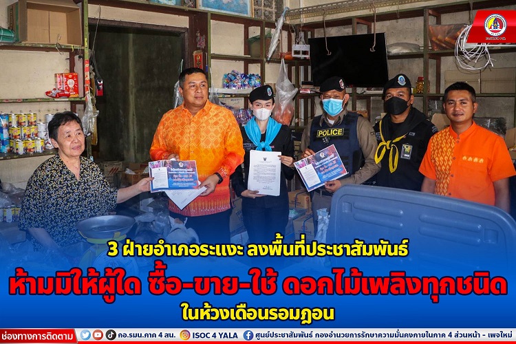 ทั้งนี้ เจ้าหน้าที่ทั้ง 3 ฝ่าย ได้ติดแผ่นพับประชาสัมพันธ์ ประชาสัมพันธ์เกี่ยวกับการห้าม ซื้อ ขาย ดอกไม้เพลิง พลุ ประทัด และวัตถุอื่นใดอันมีสภาพคล้ายคลึงกันที่ทำให้เกิดเสียงดัง ในช่วงเดือนรอมฎอน ตั้งแต่วันที่ 20 มีนาคม 2566 ถึง วันที่ 30 เมษายน 2566 เพื่อให้ช่วงเดือนรอมฎอน เป็นช่วงเวลาที่ศาสนิกในศาสนาอิสลามได้ปฏิบัติศาสนกิจอันบริสุทธิ์ด้วยความสงบ ปราศจากเหตุการณ์ที่กระทบต่อการปฏิบัติศาสนกิจทั้งปวง อีกทั้งเพื่อเป็นการส่งเสริมการปฏิบัติศาสนกิจของผู้นับถือศาสนาอิสลาม และเพื่อป้องกันอุบัติเหตุที่เกิดขึ้นจากการเล่นดอกไม้เพลิง ลูกประทัด แก่เยาวชนในพื้นที่ หากผู้ใดฝ่าฝืนต้องระวางโทษจำคุกไม่เกิน 2 ปี หรือปรับไม่เกิน 40,000 บาท หรือทั้งจำทั้งปรับ