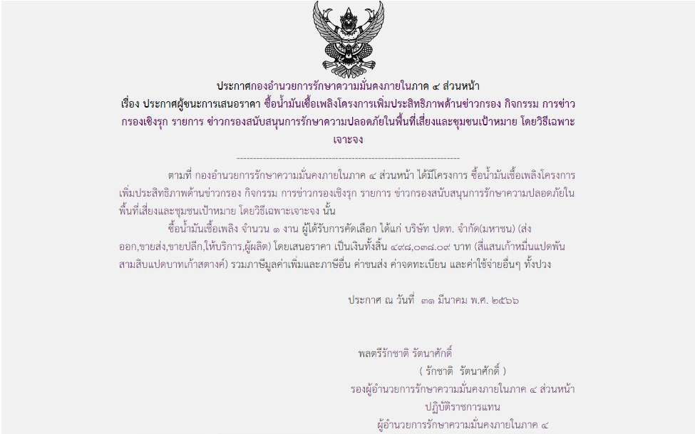 จัดซื้อ จัดจ้างประกาศผู้ชนะการเสนอราคา ประกาศผู้ชนะการเสนอราคา ซื้อน้ำมันเชื้อเพลิงโครงการเพิ่มประสิทธิภาพด้านข่าวกรอง กิจกรรม การข่าว กรองเชิงรุก รายการ ข่าวกรองสนับสนุนการรักษาความปลอดภัยในพื้นที่เสี่ยงและชุมชนเป้าหมาย โดยวิธีเฉพาะเจาะจง March 31, 2023 421 Share Facebook Twitter Google+ Telegram LINE