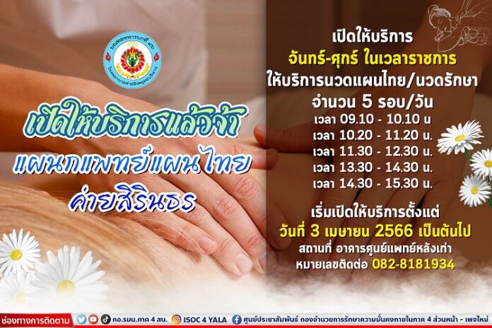 ตั้งแต่วันที่ 3 เมษายน 2566 เป็นต้นไป จะมีการเปิดให้บริการนวดแผนไทย ณ อาคารศูนย์แพทย์ (หลังเก่า) ค่ายสิรินธร ตำบลเขาตูม อำเภอยะรัง จังหวัดปัตตานี โดยเจ้าหน้าที่จากแผนกแพทย์แผนไทย ค่ายสิรินธร สังกัดโรงพยาบาลค่ายอิงคยุทธบริหาร