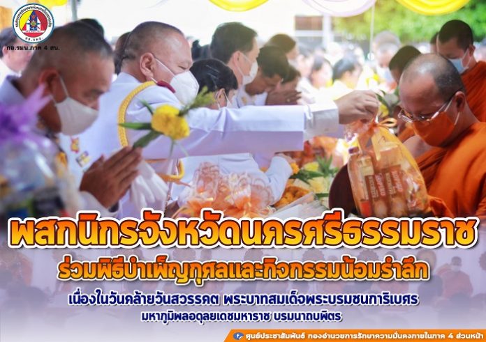 วันนี้ ( 13 ต.ค. 63, 0700 ) เนื่องในโอกาสวันคล้ายวันสวรรคต พระบาทสมเด็จพระบรมชนกาธิเบศร มหาภูมิพลอดุลยเดชมหาราช บรมนาถบพิตร 13 ตุลาคม 2563 พล.ท.เกรียงไกร ศรีรักษ์ มทภ. 4 พร้อมด้วยนายทหารชั้นผู้ใหญ่กองทัพภาคที่ 4 ส่วนราชการ ข้าราชการ และพี่น้องประชาชนทุกหมู่เหล่า ร่วมพิธีสวดพระพุทธมนต์ ทำบุญตักบาตรแด่พระภิกษุสงฆ์จำนวน 89 รูป ถวายพระราชกุศล น้อมรำลึกเนื่องในวันคล้ายวันสวรรคต ณ วัดพระมหาธาตุวรมหาวิหาร อ.เมือง จ.นครศรีธรรมราช ก่อนเดินทางไปยัง หอประชุมเมืองนครศรีธรรมราช เพื่อร่วมพิธีวางพวงมาลาและถวายบังคม เบื้องหน้าพระบรมฉายาลักษณ์ของพระบาทสมเด็จพระบรมชนกาธิเบศรมหาภูมิพลอดุลยเดชมหาราช บรมนาถบพิตร โดยมี นายไกรศร วิศิษฎ์วงศ์ ผู้ว่าราชการจังหวัดนครศรีธรรมราชเป็นประธาน โดยส่วนราชการในพื้นที่สวมเครื่องแบบปกติขาว และประชาชนต่างพร้อมใจกันแต่งกายสีโทนเหลืองกว่า 1 พันคน ร่วมพิธีเพื่อถวายเป็นพระราชกุศลและน้อมรำลึกในพระมหากรุณาธิคุณอันล้นพ้นหาที่สุดมิได้ของพระบาทสมเด็จพระบรมชนกาธิเบศรมหาภูมิพลอดุลยเดชมหาราช บรมนาถบพิตร ที่ได้ทรงบำเพ็ญพระราชกรณียกิจนานัปการ เพื่อบำบัดทุกข์บำรุงสุขแก่ปวงชนชาวไทยมาตลอดนับตั้งแต่เสด็จเถลิงถวัลยราชสมบัติตราบจนกระทั่งเสด็จสวรรคต