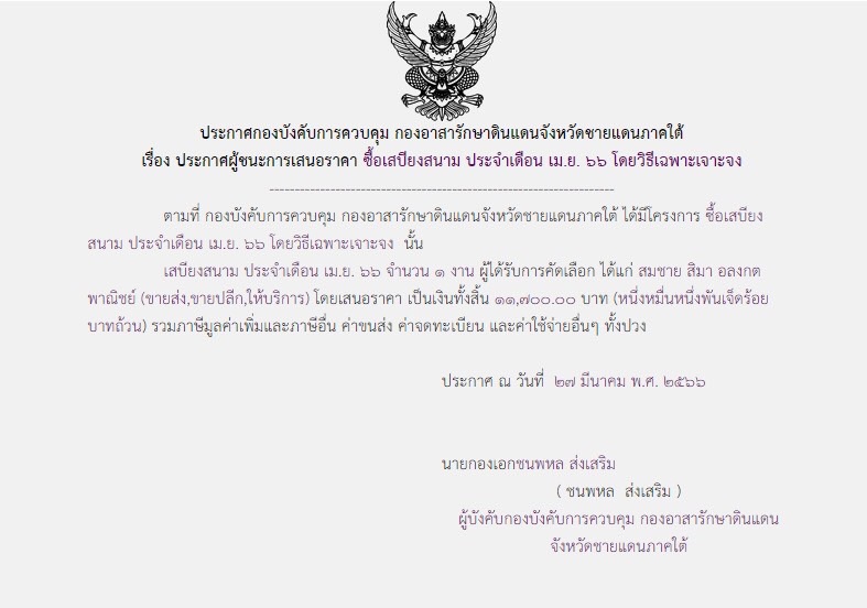 ประกาศผู้ชนะการเสนอราคา ซื้อเสบียงสนาม ประจำเดือน เม.ย. ๖๖ โดยวิธีเฉพาะเจาะจง