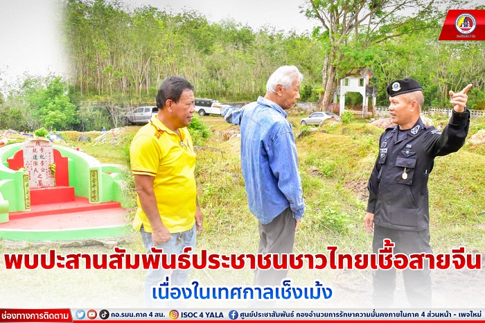 เมื่อวันที่ 5 เมษายน 2566 เวลา 11.00 น. ณ สุสานจีน ตำบลรือเสาะออก อำเภอรือเสาะ จังหวัดนราธิวาส พันเอก สิทธิขัย บำรุงเขต ผู้บังคับหน่วยเฉพาะกิจกรมทหารพรานที่ 46 ลงพื้นที่เข้าพบปะพูดคุยสานสัมพันธ์ กับนายจักรพันธ์ บัณฑรเศรษฐ์ ประธานคณะกรรมการมูลนิธิรือเสาะประชานุเคราะห์ และประชาชนชุมชนไทยพุทธเชื้อสายจีน โดยมีประชาชนชาวไทยเชื้อสายจีน จากนอกพื้นที่และในพื้นที่อำเภอรือเสาะ มาทำพิธีไหว้บรรพบุรุษ เนื่องในเทศกาลเช็งเม้งของชาวไทยเชื้อสายจีน พร้อมทั้งได้พูดคุยสอบถามปัญหาข้อขัดข้องต่างๆ แลกเปลี่ยนข้อมูลข่าวสาร อีกทั้งยังได้เสริมสร้างความสัมพันธ์อันดีต่อกัน