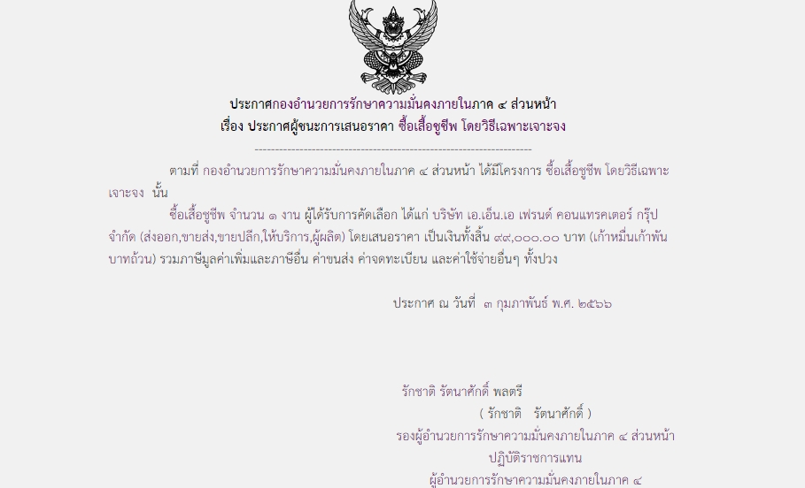 ประกาศผู้ชนะการเสนอราคา ซื้อเสื้อชูชีพ โดยวิธีเฉพาะเจาะจง