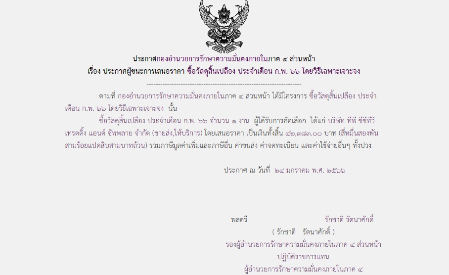 ประกาศผู้ชนะการเสนอราคา ซื้อวัสดุสิ้นเปลือง ประจำเดือน ก.พ. ๖๖ โดยวิธีเฉพาะเจาะจง