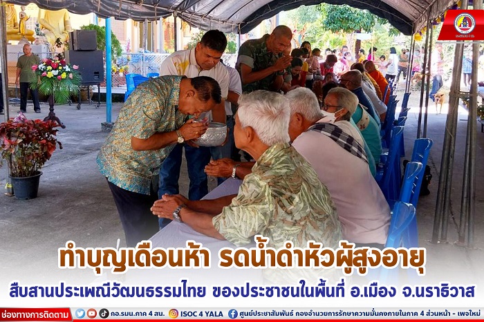เมื่อวันที่ 6 เมษายน 2566 เวลา 10.30 น. ณ วัดลำภู ตำบลลำภู อำเภอเมือง จังหวัดนราธิวาส กองร้อยปืนเล็กที่ 2 หน่วยเฉพาะกิจนาวิกโยธิน กองทัพเรือ 33 ร่วมงานประเพณีทำบุญเดือนห้า รดน้ำดำหัวผู้สูงอายุ เพื่อสืบสานประเพณีวัฒนธรรมไทย ของประชาชนในพื้นที่ บ้านคลองไทร หมู่ที่ 1 และบ้านลำภู หมู่ที่ 2 ตำบลลำภู อำเภอเมือง จังหวัดนราธิวาส ทั้งนี้ยังเป็นการสืบทอดประเพณีอันดีงามของไทย และเป็นสิริมงคลในชีวิต โดยบูรณาการด้วยความร่วมมือร่วมใจกันจากความรักความสามัคคี อันจะนำมาซึ่งความเจริญรุ่งเรืองของจังหวัดนราธิวาส