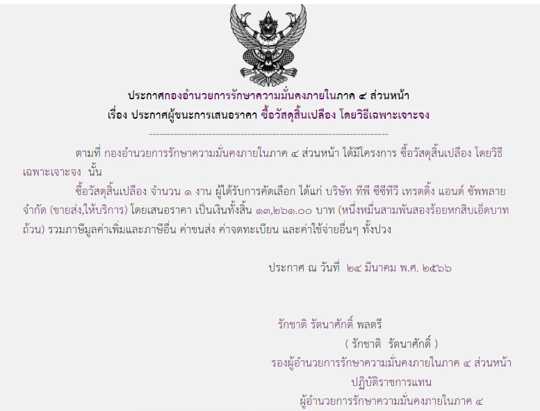 ประกาศผู้ชนะการเสนอราคา ซื้อวัสดุสิ้นเปลือง โดยวิธีเฉพาะเจาะจง