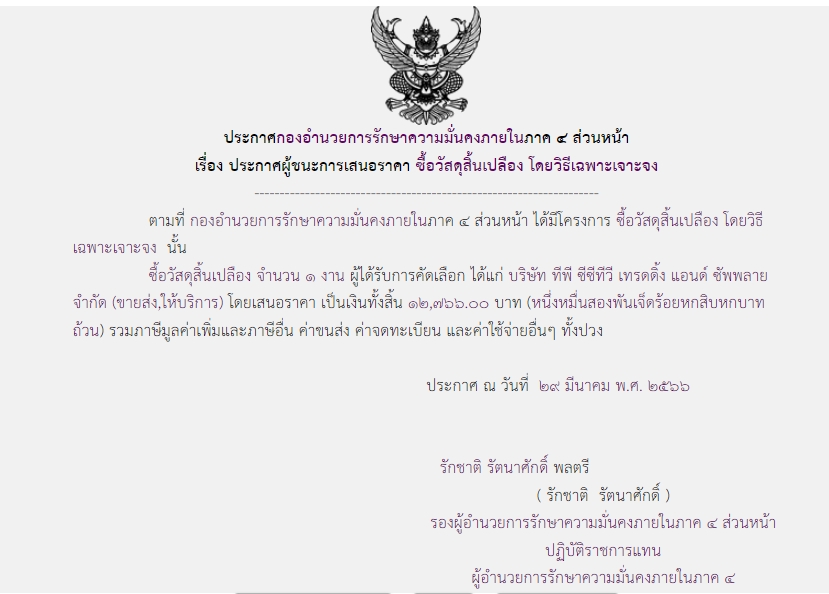 ประกาศผู้ชนะการเสนอราคา ซื้อวัสดุสิ้นเปลือง โดยวิธีเฉพาะเจาะจง