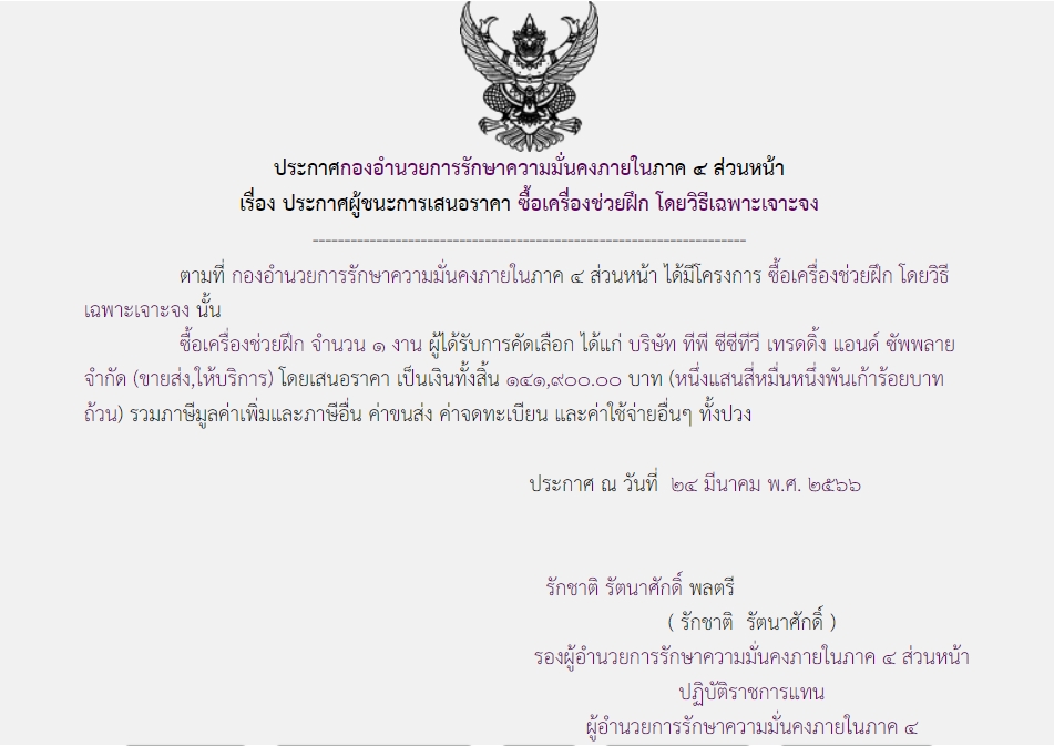 ประกาศผู้ชนะการเสนอราคา ซื้อเครื่องช่วยฝึก โดยวิธีเฉพาะเจาะจง