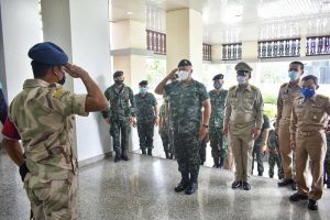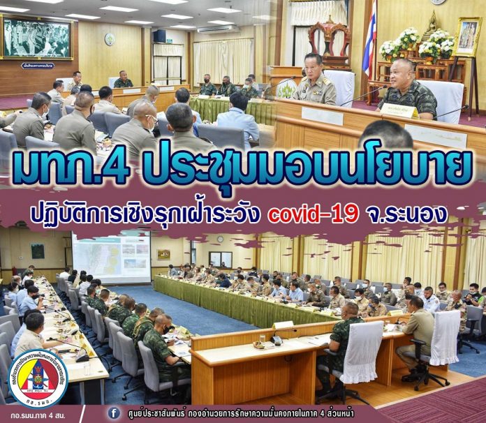 วันที่ 13 ตุลาคม 2563 ที่ห้องประชุมรัตนรังสรรค์ ชั้น 5 ศาลากลางจังหวัดระนอง อำเภอเมือง จังหวัดระนอง พลโท เกรียงไกร ศรีรักษ์ แม่ทัพภาคที่ 4 เป็นประธานการประชุมร่วมกับ นาย สมเกรียติ ศรีษะเนตร ผู้ว่าราชการจังหวัดระนอง หัวหน้าหน้าหน่วยงาน ส่วนราชการในพื้นที่ เพื่อติดตามนโยบายและข้อสั่งการของหน่วยงานที่เกี่ยวข้องในการดำเนินการ การควบคุมพื้นที่ตามแนวชายแดน การสร้างการรับรู้กับพี่น้องประชาชนให้ตระหนักเรื่องการป้องกันการติดเชื้อไวรัส Covid-19 การลักลอบเข้าเมืองของแรงงานต่างด้าวที่ผิดกฎหมาย ภาครัฐต้องช่วยกันสื่อสาร ทำความเข้าใจกับประชาชนในชุมชน หมู่บ้าน ตลอดจนนายจ้างและสถานประกอบการให้เข้าเข้าใจในเรื่องมาตรการทางด้านกฎหมาย เพื่อป้องกันการแพร่ระบาดของ Covid-19 ในกลุ่มแรงงานต่างด้าว โดยให้สำนักงานสาธารณสุขจังหวัดและผู้เกี่ยวข้องหารือแนวทางในการป้องกันสถานการณ์ที่สุ่มเสี่ยงระลอกที่ 2 เนื่องจากสถานการณ์ของประเทศเพื่อนบ้านมีอัตราผู้ติดเชื้ออย่างต่อเนื่อง