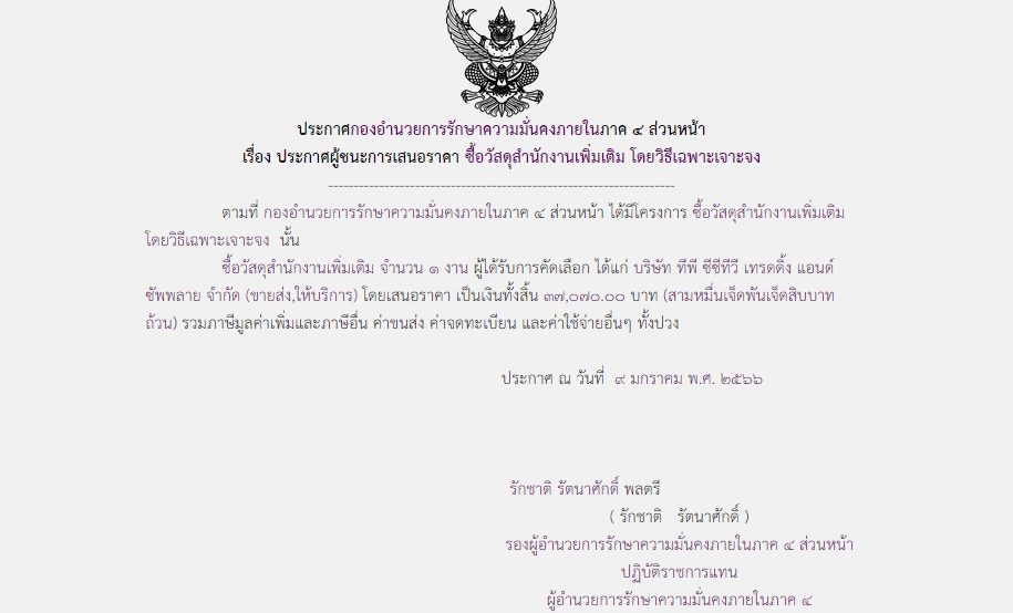 ประกาศผู้ชนะการเสนอราคา ซื้อวัสดุสำนักงานเพิ่มเติม โดยวิธีเฉพาะเจาะจง