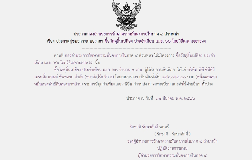ประกาศผู้ชนะการเสนอราคา ซื้อวัสดุสิ้นเปลือง ประจำเดือน เม.ย. ๖๖ โดยวิธีเฉพาะเจาะจง