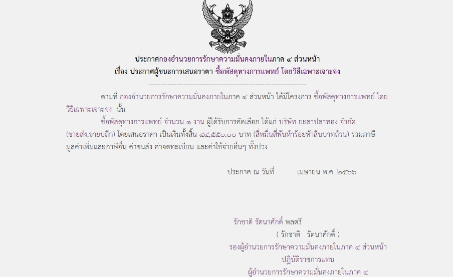ประกาศผู้ชนะการเสนอราคา ซื้อวัสดุทางการแพทย์ โดยวิธีเฉพาะเจาะจง