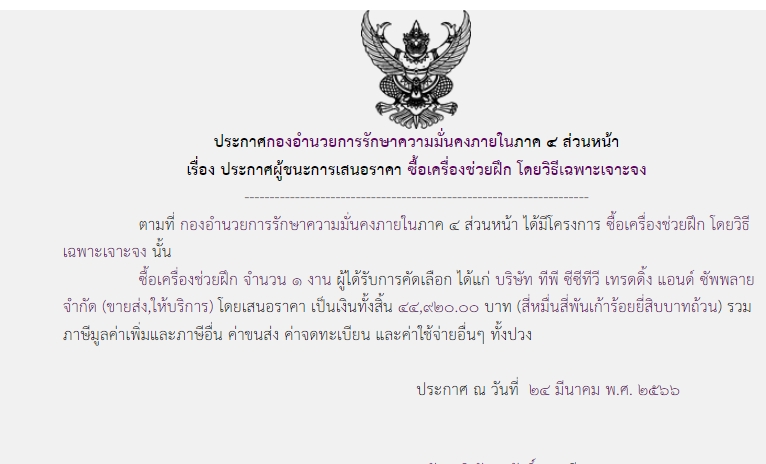 ประกาศผู้ชนะการเสนอราคา ซื้อเครื่องช่วยฝึก โดยวิธีเฉพาะเจาะจง