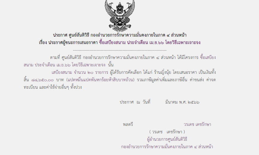 ประกาศผู้ชนะการเสนอราคา ซื้อเสบียงสนาม ประจำเดือน เม.ย. ๖๖ โดยวิธีเฉพาะเจาะจง