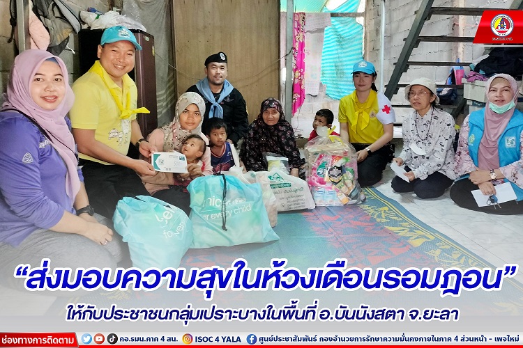 เมื่อวันที่ 16 เมษายน 2566 ณ พื้นที่ บ้านทรายแก้ว หมู่ที่ 3 ตำบลตลิ่งชัน อำเภอบันนังสตา จังหวัดยะลา หน่วยเฉพาะกิจกรมทหารพรานที่ 30 จัดกำลังพลจิตอาสาของหน่วย ร่วมกับ สมาคมฟ้าใส ส่งเสริมสุขภาวะเด็กและเยาวชนชายแดนใต้ มูลนิธิคนช่วยฅน และผู้นำหมู่บ้าน ลงพื้นที่จัดกิจกรรม “ส่งมอบความสุขในห้วงเดือนรอมฎอน” ให้กับประชาชนกลุ่มเปราะบางในพื้นที่ โดยภายในกิจกรรมประกอบด้วย การให้คำแนะนำในการดูแลสุขภาพในห้วงเดือนรอมฎอน พร้อมกับมอบชุดยาพระราชทาน และมอบเงินช่วยเหลือในเบื้องต้น พร้อมทั้งสิ่งของเครื่องอุปโภคบริโภคที่จำเป็นในการดำรงชีวิตประจำวันให้กับประชาชนผู้ยากไร้ จำนวน 2 ครอบครัว และผู้พิการ (ผู้ป่วยติดเตียง) จำนวน 1 ครอบครัว เพื่อให้กำลังใจ และยกระดับคุณภาพชีวิตของประชาชนให้ดีขึ้น เพราะเราจะอยู่เคียงข้างประชาชนในทุกโอกาส