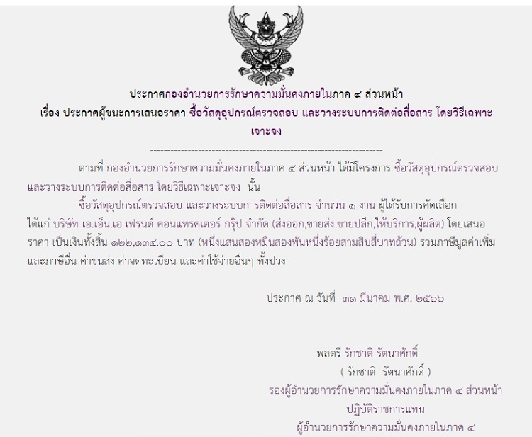 ประกาศผู้ชนะการเสนอราคา ซื้อวัสดุอุปกรณ์ตรวจสอบ และวางระบบการติดต่อสื่อสาร โดยวิธีเฉพาะเจาะจง(122,134.00-)