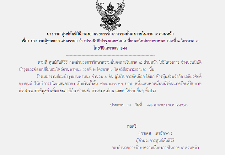 จัดซื้อ จัดจ้างประกาศผู้ชนะการเสนอราคา ประกาศผู้ชนะการเสนอราคา จ้างปรนนิบัติบำรุงและซ่อมเปลี่ยนอะไหล่ยานพาหนะ งวดที่2 ไตรมาส 3 โดยวิธีเฉพาะเจาะจง(161,840.00-) April 17, 2023 315 Share Facebook Twitter Google+ Telegram LINE