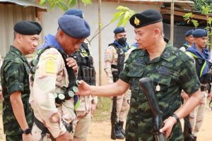 วันที่ (17 เมษายน 2566) พลตรี ไพศาล หนูสังข์ รองแม่ทัพภาคที่ 4 / รองผู้อำนวยการรักษาความมั่นคงภายในภาค 4 ส่วนหน้าพร้อมด้วย พลตรี ปราโมทย์ พรหมอินทร์ รองแม่ทัพภาคที่ 4 / รองผู้อำนวยการรักษาความมั่นคงภายในภาค 4 ส่วนหน้า และคณะ เดินทางลงพื้นที่ตรวจเยี่ยมให้กำลังใจอาสาสมัครชุดคุ้มครองตำบล (ชคต.) ในพื้นที่จังหวัดนราธิวาส เพื่อตรวจเยี่ยมสอบถามสภาพความเป็นอยู่ รวมถึงรับทราบปัญหาข้อขัดข้องของชุดคุ้มครองตำบล พร้อมหารือ ติดตามแนวทางการปฏิบัติงาน ให้มีประสิทธิภาพมากยิ่งขึ้น โดยได้ลงตรวจเยี่ยม จำนวน 2 ชุด ประกอบด้วย ชุดคุ้มครองตำบลร่มไทร อำเภอสุคิริน จังหวัดนราธิวาส และชุดคุ้มครองตำบลกาลิซา อำเภอระแงะ จังหวัดนราธิวาส เพื่อสร้างความเชื่อมั่น และให้กำลังใจแก่เจ้าหน้าที่ ให้มีความพร้อมในการปฏิบัติหน้าที่ในการดูแลพี่น้องประชาชนและดูแลความเรียบร้อยสร้างความสงบสุขให้เกิดขึ้นในพื้นที่ โอกาสนี้ คณะรองผู้อำนวยการรักษาความมั่นคงภายในภาค 4 ส่วนหน้า ได้มอบสิ่งของบริโภค เพื่อเป็นการสร้างขวัญและกำลังใจแก่เจ้าหน้าที่ชุดคุ้มครองตำบลอีกด้วย