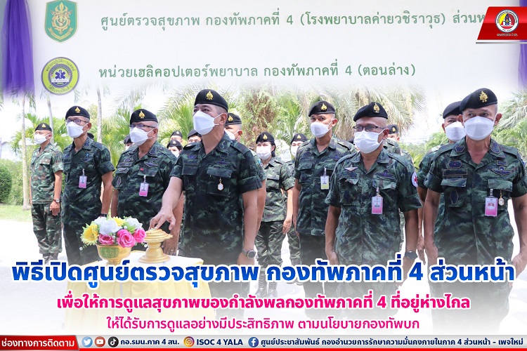 วันนี้ 18 เมษายน 2566 เวลา 10.30. ณ ศูนย์ประสานการแพทย์จังหวัดชายแดนภาคใต้ ค่ายสิรินธร ตำบลเขาตูม อำเภอยะรัง จังหวัดปัตตานี พลโท ศานติ ศกุนตนาค แม่ทัพภาคที่ 4 /ผู้อำนวยการรักษาความมั่นคงภายในภาค 4 เป็นประธานในพิธีเปิดศูนย์ตรวจสุขภาพกองทัพภาคที่ 4 ส่วนหน้า เพื่อให้การดูแลสุขภาพของกำลังพลกองทัพภาคที่ 4 ที่อยู่ห่างไกลจากโรงพยาบาลค่ายวชิราวุธให้ได้รับการดูแลอย่างมีประสิทธิภาพตามนโยบายกองทัพบก โดยจัดให้มีแพทย์เฉพาะทางสาขาต่างๆ ที่มีความจำเป็นจากโรงพยาบาลค่ายวชิราวุธและระบบการตรวจต่างๆ ที่มีความจำเป็น โดยมี พลตรี โชคชัย ขวัญพิชิต ผู้อำนวยการโรงพยาบาลค่ายวชิราวุธ/ผู้อำนวยการศูนย์ประสานการแพทย์จังหวัดชายแดนภาคใต้ พร้อมด้วย ผู้บังคับบัญชาและเจ้าหน้าที่ร่วมให้การต้อนรับ