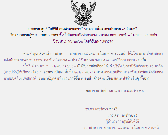 จัดซื้อ จัดจ้างประกาศผู้ชนะการเสนอราคา ประกาศผู้ชนะการเสนอราคา ซื้อน้ำมันลาผลัดพักตามวงรอบของ ศสว. งวดที่ 2 ไตรมาส 3 ประจำปีงบประมาณ 2566 โดยวิธีเฉพาะเจาะจง (242,872.88-) April 18, 2023 396 Share Facebook Twitter Google+ Telegram LINE