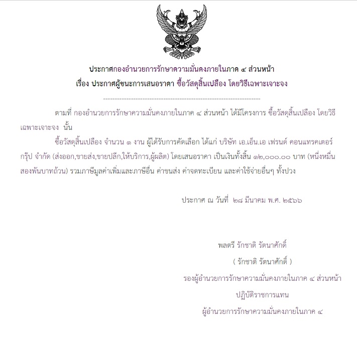 ประกาศผู้ชนะการเสนอราคา ซื้อวัสดุสิ้นเปลือง โดยวิธีเฉพาะเจาะจง (12,000.00-)