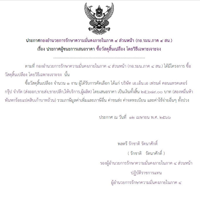 ประกาศผู้ชนะการเสนอราคา ซื้อวัสดุสิ้นเปลือง โดยวิธีเฉพาะเจาะจง