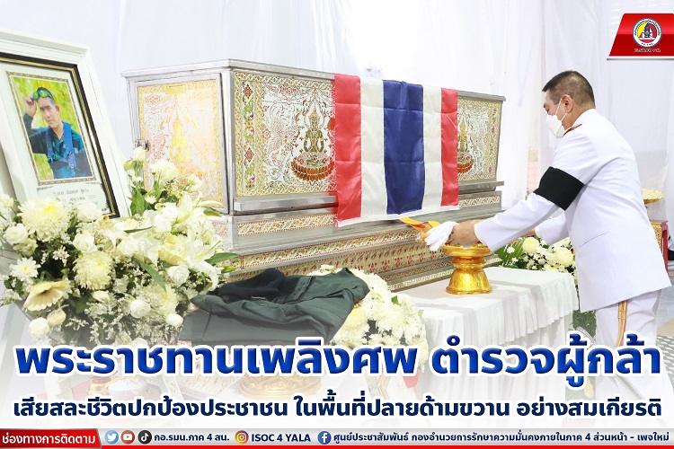 วันนี้ ( 24 เมษายน 2566) เวลา 13.45 น. ที่วัดพุทธภูมิพระอารามหลวง อำเภอเมือง จังหวัดยะลา พลตำรวจโท นันทเดช ย้อยนวล ผู้บัญชาการตำรวจภูธรภาค 9 / ผู้บัญชาการศูนย์ปฏิบัติการสำนักงานตำรวจแห่งชาติส่วนหน้า เป็นประธานประกอบพิธีพระราชทานเพลิงศพ สิบตำรวจตรี นันทยศ ชูดวง กำลังพลสังกัดกองกำลังตำรวจตระเวนชายแดน จังหวัดชายแดนภาคใต้ ส่วนปฏิบัติการกองกำลังตำรวจจังหวัดชายแดนภาคใต้ ที่เสียชีวิตขณะออกสืบสวนหาข่าวและตรวจสอบเสาสัญญาณโทรศัพท์ โดยเกิดเหตุคนร้ายไม่ทราบจำนวนลอบวางระเบิด ชุดเฝ้าตรวจชายแดนที่ 4410 บริเวณบ้านตอออ หมู่ที่ 1 ตำบลกายูคละ อำเภอแว้ง จังหวัดนราธิวาส เมื่อวันที่ 20 เมษายน 2566 ที่ผ่านมา เป็นเหตุให้เจ้าหน้าที่ตำรวจได้รับบาดเจ็บ 2 นาย และ เสียชีวิตในเวลาต่อมา 1 นาย คือ สิบตำรวจตรี นันทยศ ชูดวง โดยมี พลโท ศานติ ศกุนตนาค แม่ทัพภาคที่ 4/ ผู้อำนวยการรักษาความมั่นคงภายในภาค 4 ,ผู้บังคับบัญชา , หัวหน้าส่วนราชการ , กำลังพล ประชาชนในพื้นที่และครอบครัวร่วมในพิธีฯ