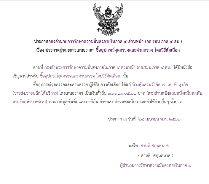 ประกาศผู้ชนะการเสนอราคา ซื้ออุปกรณ์จุดตรวจและด่านตรวจ โดยวิธีคัดเลือก