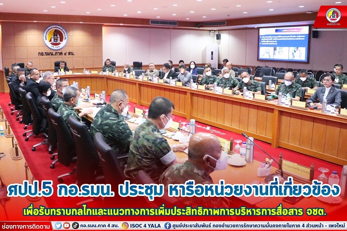 โดยผู้อำนวยการศูนย์ประสานการปฏิบัติที่ 5 กองอำนวยการรักษาความมั่นคงภายในราชอาณาจักร และคณะ ได้ร่วมประชุมหารือกับส่วนราชการในพื้นที่จังหวัดชายแดนภาคใต้ที่เกี่ยวข้อง ในงานการบริหารการสื่อสาร พร้อมทั้งกำกับ ติดตาม และประสานการปฏิบัติงานการขับเคลื่อนกลไกการบริหารการสื่อสารในพื้นที่จังหวัดชายแดนภาคใต้ หรือ SBIC (Southren Border Information Center) ให้เกิดความเหมาะสม ลดอุปสรรคในการดำเนินการ และก่อให้เกิดประสิทธิภาพมากขึ้น สามารถตอบสนองงานการประชาสัมพันธ์ สร้างการรับรู้ ความเข้าใจในการแก้ไขปัญหาจังหวัดชายแดนภาคใต้ รวมทั้งสรุปผลผลสัมฤทธิ์และปัญหาอุปสรรค ในการขับเคลื่อนกลไกการบริหารประเด็นจังหวัดชายแดนภาคใต้ (SBIC) ในห้วงที่ผ่านมา เพื่อให้ การดำเนินงานตามกลไก SBIC เป็นไปในทิศทางเดียวกัน โดยมีการเชื่อมโยงการทำงานเพื่อไม่ให้ซ้ำซ้อนกัน และมีขั้นตอนการพิจารณากลั่นกรองประเด็น พร้อมทั้งสามารถสื่อสารชี้แจงประเด็น ข้อเท็จจริง ขยายผล สู่ประชาชนให้เกิดการรับรู้ มีความเข้าใจเกี่ยวกับการดำเนินงานของรัฐ ได้อย่างทันท่วงที ทันต่อสถานการณ์
