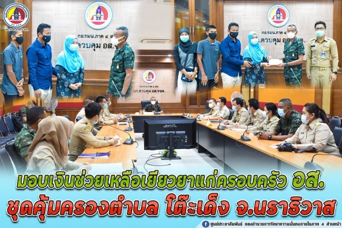 เมื่อวันที่ 16 ตุลาคม 2563 เวลา 10.00 น. พลตรี สมดุลย์ เอี่ยมเอก รองแม่ทัพภาคที่ 4/ ผู้บังคับกองบังคับการควบคุมกองกำลังอาสารักษาดินแดนจังหวัดชายแดนภาคใต้ เป็นผู้แทนแม่ทัพภาคที่ 4 มอบเงินช่วยเหลือเยียวยา ให้แก่ครอบครัวสมาชิกอาสารักษาดินแดน อส.ต.เจ๊ะมูฮัมหมัดฟีกรัน เต๊ะโช๊ะ ตำแหน่งปกติ ลูกแถว สังกัด ร้อย อส.ที่ 9 อำเภอสุไหงปาดี จังหวัดนราธิวาส เสียชีวิตจากการถูกยิงด้วยอาวุธ ณ ฐานปฏิบัติการชุดคุ้มครองตำบลโต๊ะเด็ง ญาติได้นำศพไปประกอบพิธีทางศาสนาอิสลาม ณ กูโบว์ลูยาวาติ ตำบลเจ๊ะเห อำเภอตากใบ จังหวัดนราธิวาส เมื่อวันที่ 5 ตุลาคม 2563 ที่ผ่านมา
