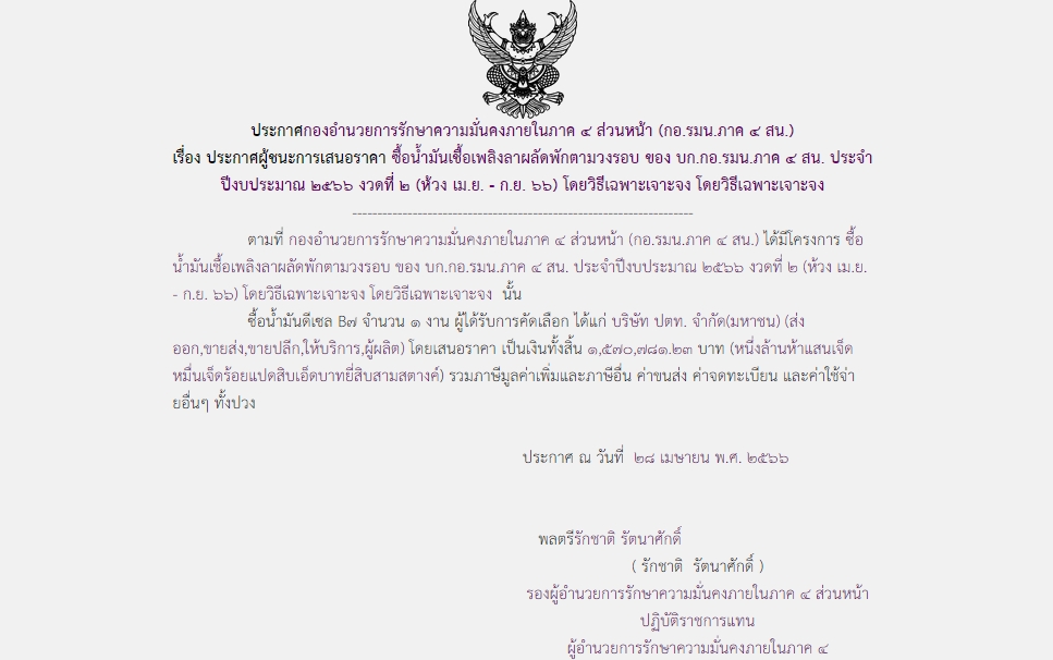 จัดซื้อ จัดจ้างประกาศผู้ชนะการเสนอราคา ประกาศผู้ชนะการเสนอราคา ซื้อน้ำมันซื้อเพลิงลาผลัดพักตามวงรอบ ของ บก.กอ.รมน.ภาค ๔ สน. ประจำ ปีงบประมาณ ๒๕๖๖ งวดที่ ๒ (ห้วง เม.ย. – ก.ย. ๖๖) April 29, 2023 387 Share Facebook Twitter Google+ Telegram LINE