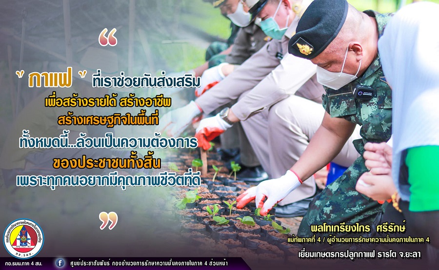“กาแฟ” ที่เราช่วยกันส่งเสริม เพื่อสร้างรายได้ สร้างอาชีพ สร้างเศรษฐกิจในพื้นที่ชายแดนใต้ ทั้งหมดนี้…ล้วนเป็นความต้องการของประชาชนทั้งสิ้น เพราะทุกคนอย่างมีคุณภาพชีวิตที่ดี ลูกหลานจะได้ไม่ทิ้งถิ่นฐานบ้านเกิด รักและหวงแหนบ้านของตน และสันติสุขก็จะบังเกิดตามมา พลโทเกรียงไกร ศรีรักษ์ แม่ทัพภาคที่ 4 /ผู้อำนวยการรักษาความมั่นคงภายในภาค 4 พบปะเยี่ยมเกษตรกรผู้ปลูกกาแฟ อ.ธารโต. จ.ยะลา