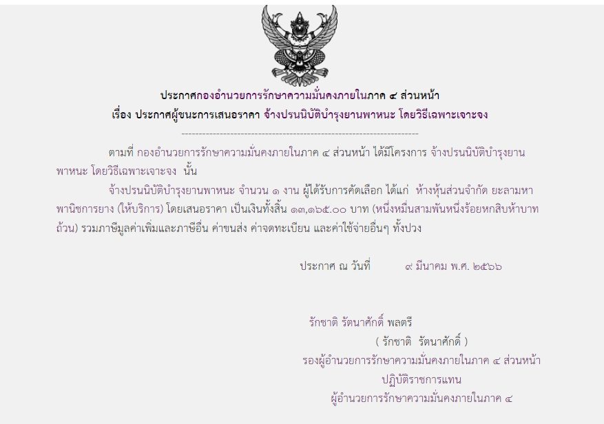 ประกาศผู้ชนะการเสนอราคา จ้างปรนนิบัติบำรุงยานพาหนะ โดยวิธีเฉพาะเจาะจง