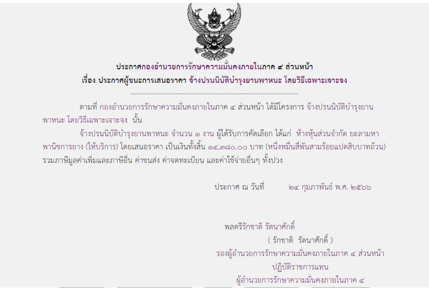 ประกาศผู้ชนะการเสนอราคา จ้างปรนนิบัติบำรุงยานพาหนะ โดยวิธีเฉพาะเจาะจง